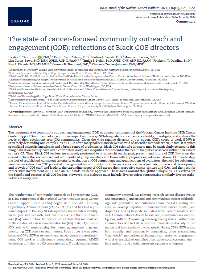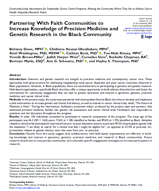 Hayley S. Thompson, PhD, is a professor in the Department of Oncology at Wayne State University School of Medicine. She is the inaugural Associate Center Director for Community Outreach and Engagement (COE) at Karmanos Cancer Institute (KCI), a National Cancer Institute (NCI)-Designated Comprehensive Cancer Center. She is also founding director of WSU’s Community-Engaged Collaborative for the Promotion of Access to Technology and Health (CEC-PATH). Dr. Thompson is a clinical psychologist whose research addresses racial and ethnic disparities in cancer care and outcomes, including cancer survivorship. Notably, she is developer of the Group-Based Medical Mistrust Scale (GBMMS). Dr. Thompson has received past funding from NCI, Agency for Healthcare Quality and Research (AHRQ), American Cancer Society (ACS), and the Patient-Centered Outcomes Research Institute (PCORI), as well as multiple foundations.